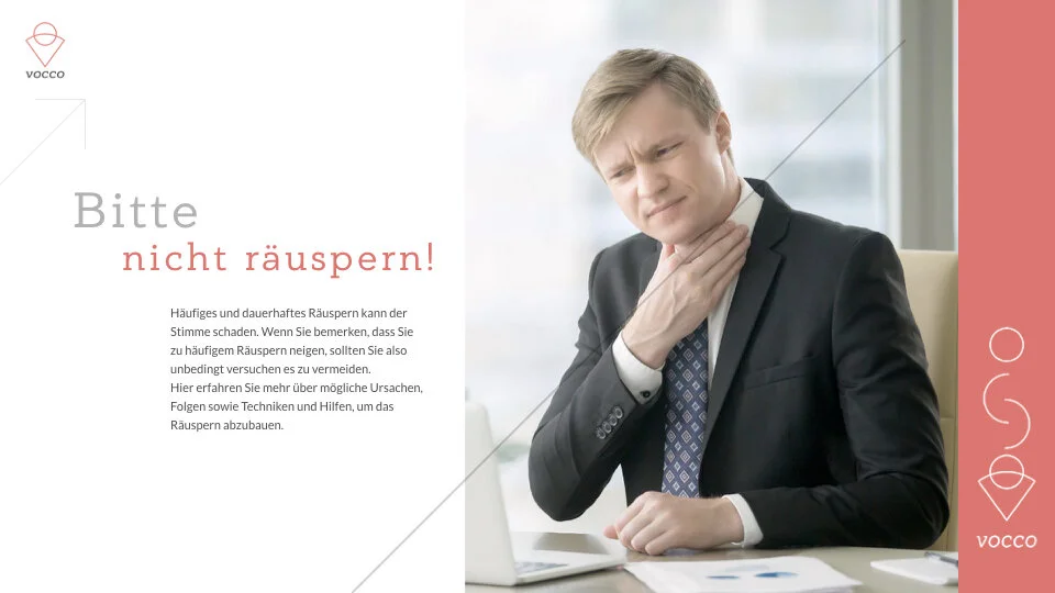 Das Räuspern und diese Missempfindungen im Kehlbereich können häufig auch in Zusammenhang mit weiteren körperlichen und psychischen Faktoren, wie z.B Überspannung im Kiefer- und Halsbereich, akuten Stressbelastungen oder depressiven Verstimmungen, stehen. Im VOCCOnsult erhalten Sie Orientierung, was die Gründe des Räusperns sein können. Sie erhalten außerdem erste Übungen und weiterführende Hinweise.