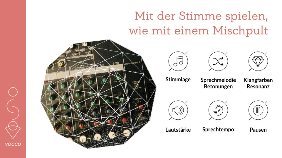 Mit diesen Mittel können spielen, wie mit einem Mischpult. Das bedeutet, dass wir aus Gewohnheit bestimme Einstellungen für die Regler unseres persönlichen Stimmmischpults gewählt haben. Es fällt uns selbst gar nicht auf, dass wir z.B. wenig Melodie oder ein sehr schnelles Sprechtempo haben.